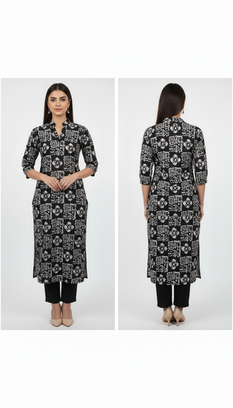 The Women’s Black & Off-White Printed Straight Kurta is a versatile ethnic staple that blends elegance, comfort, and style. Its premium fabric, straight-cut silhouette, and classic black & off-white print make it suitable for casual outings, office wear, family gatherings, and festive occasions.