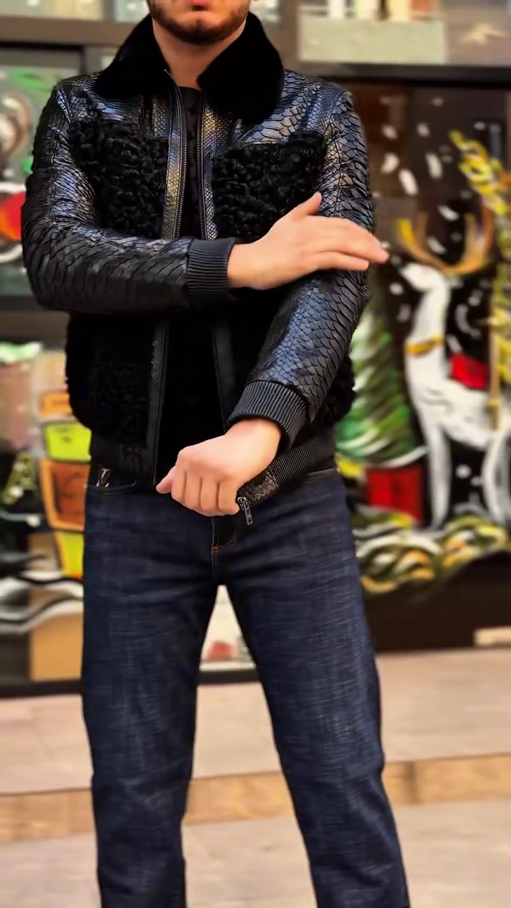 The jacket stands out with snakeskin-inspired detailing, adding a striking, textured contrast that elevates the overall aesthetic. Paired with smooth, high-quality fabric, it creates a perfect balance between boldness and sophistication.