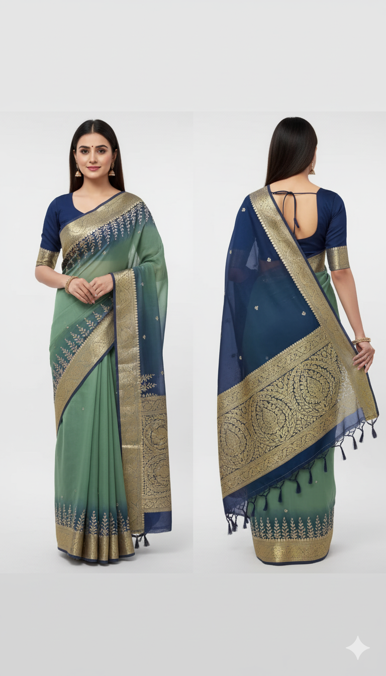 Blouse Pairing – Contrasting silk or embroidered blouse accentuates the saree’s dual-tone appeal.