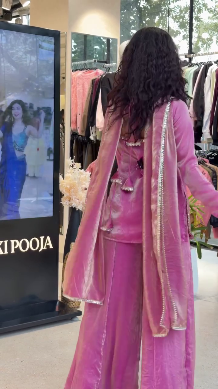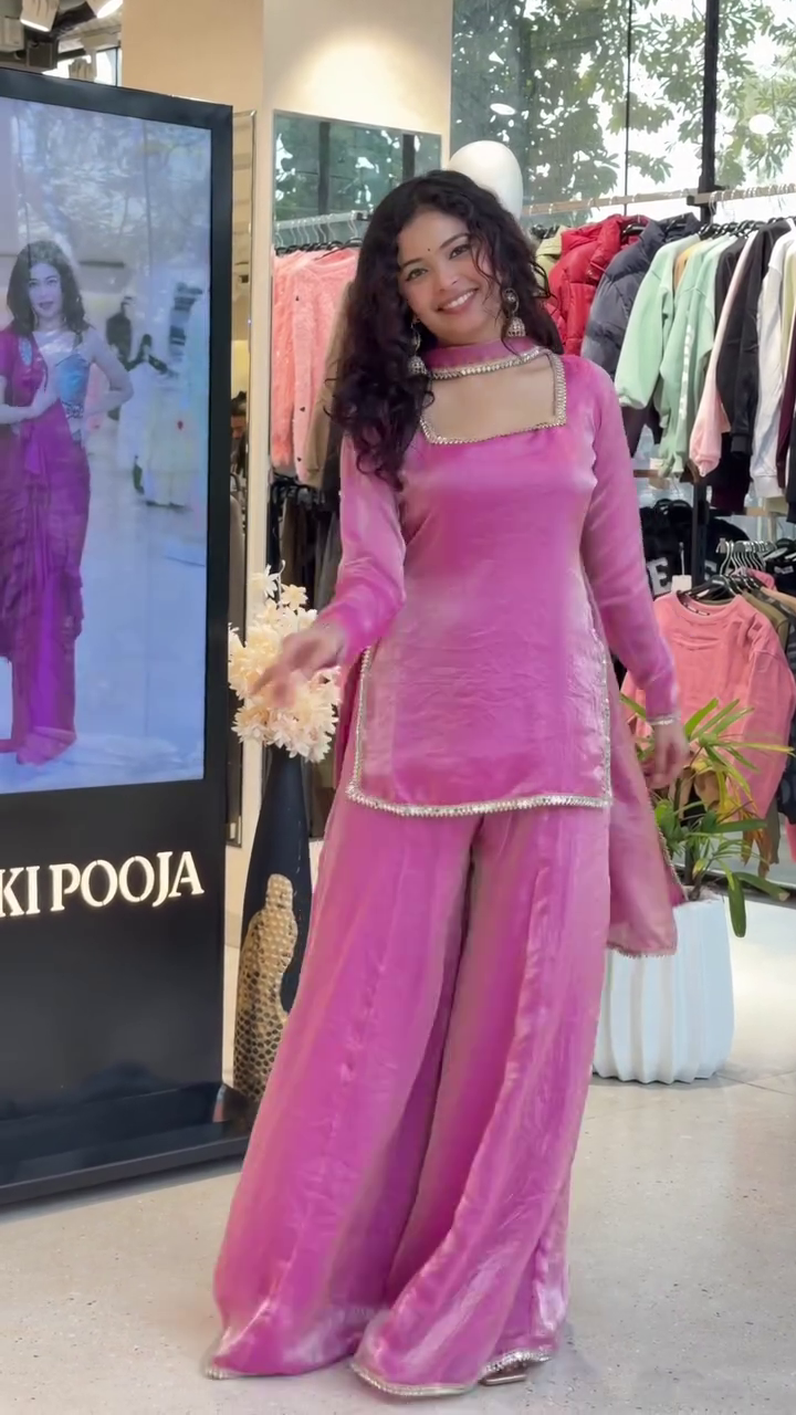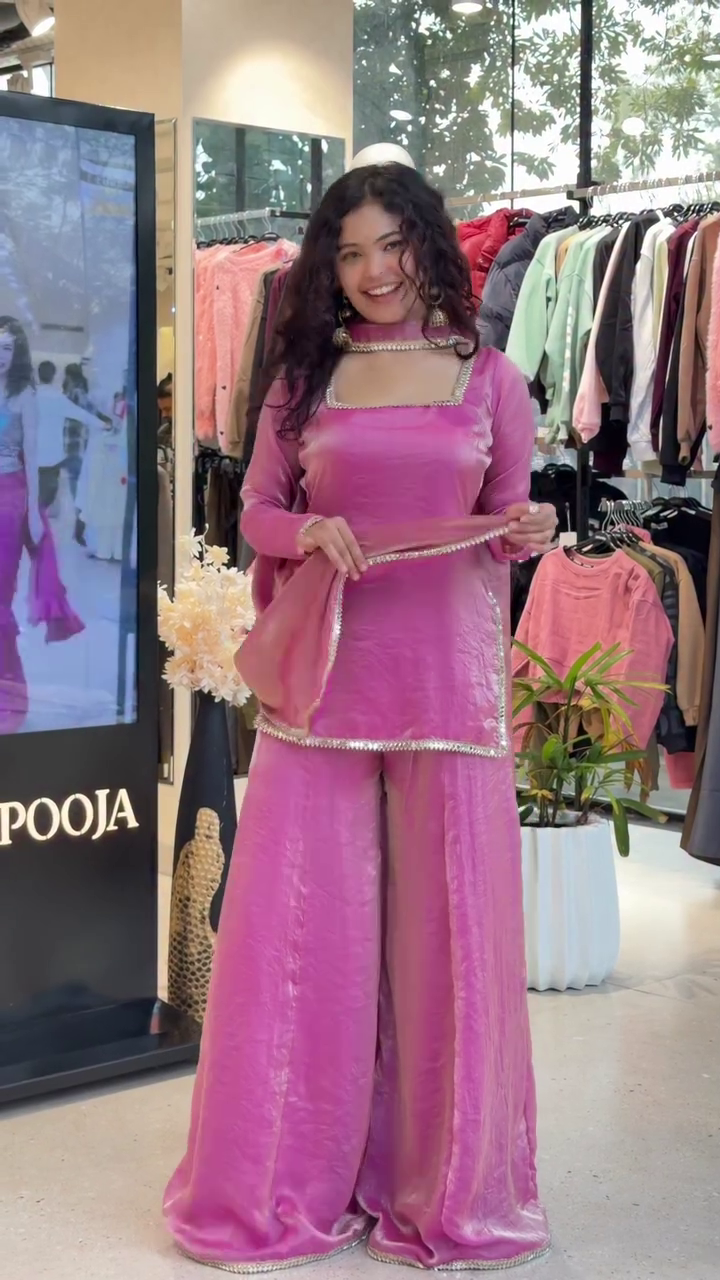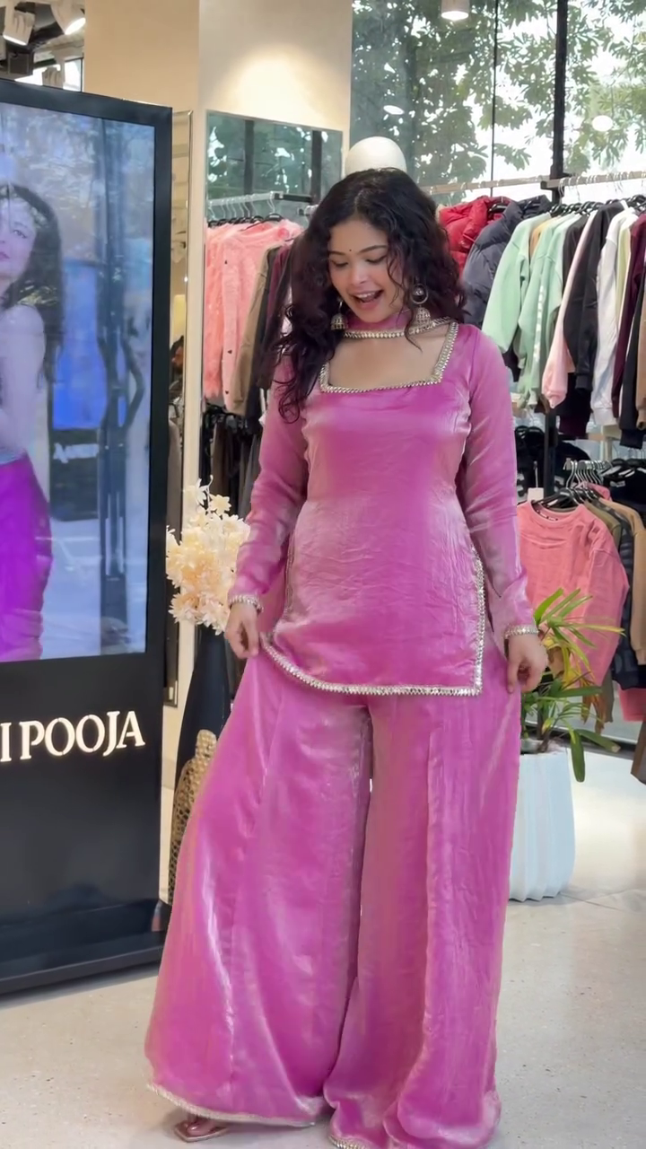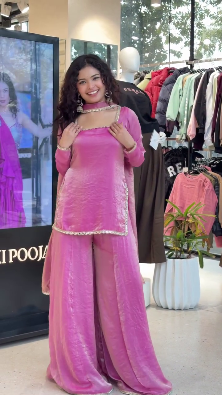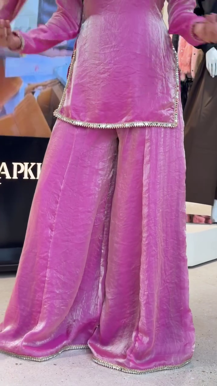 Pure Silk Pink Mirror Lace Sharara Set with Kurti and Sharara, Chiffon Dupatta, Ethnic Wear for Festive