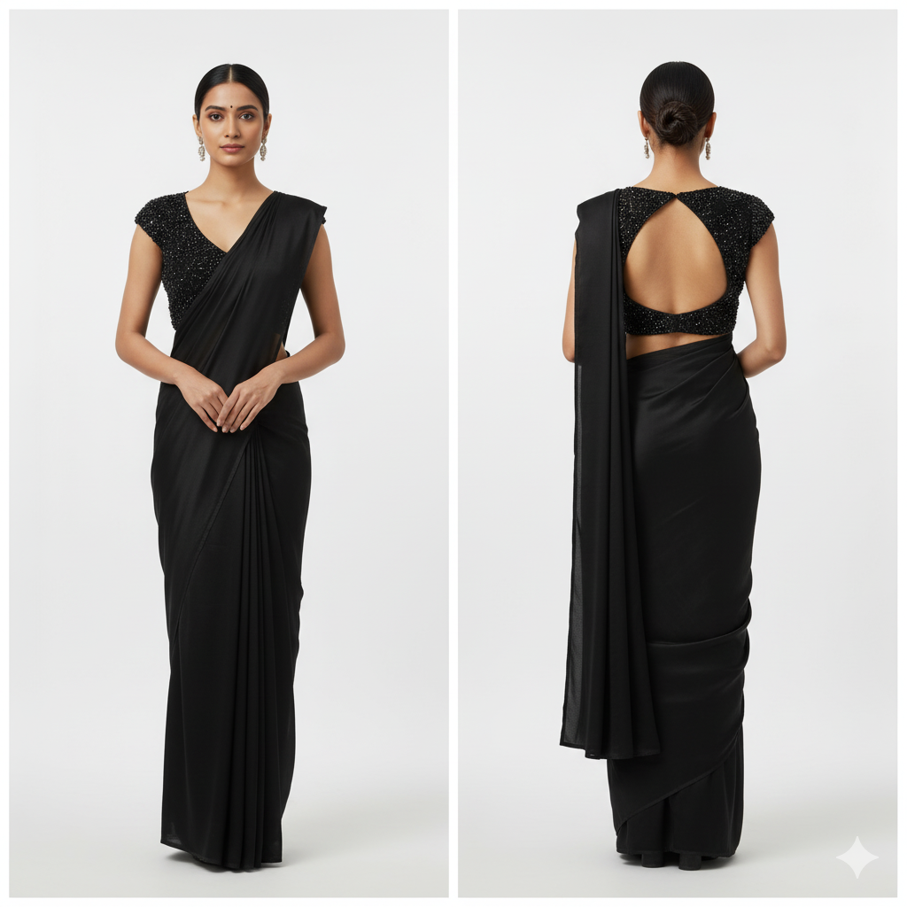 “It’s the perfect black saree – minimal yet absolutely stunning. The blouse design is a showstopper.”